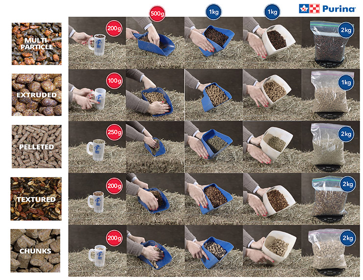 Can you give me a visual reference to evaluate the weight of a feed according to its texture and the scoop used?